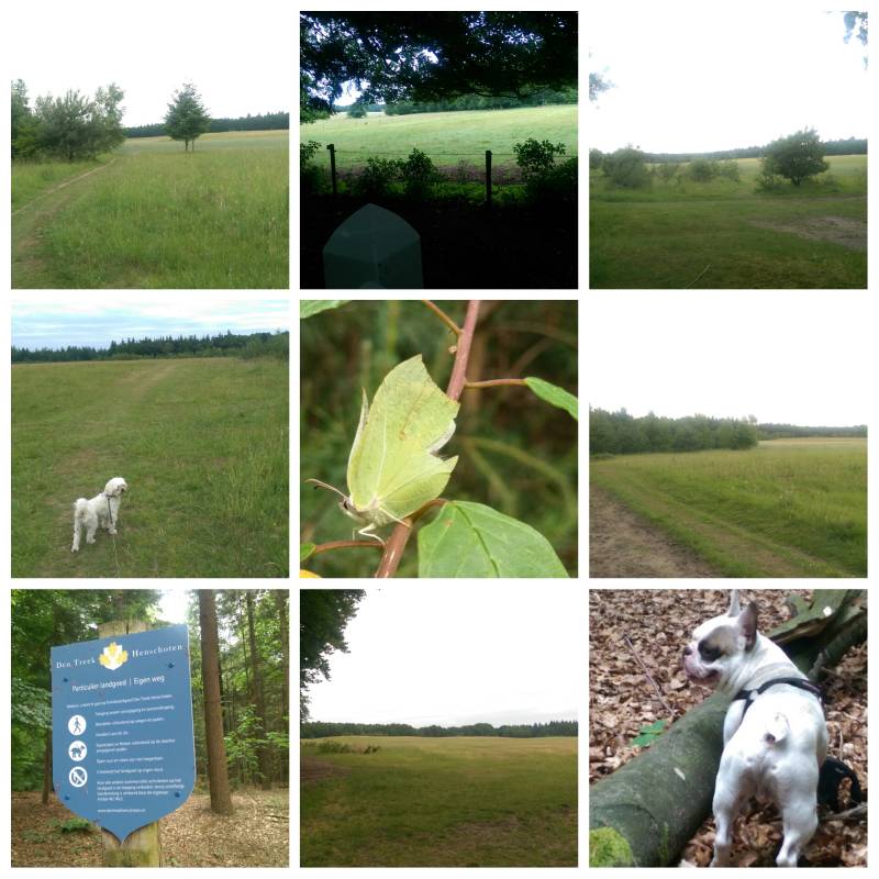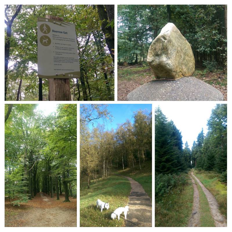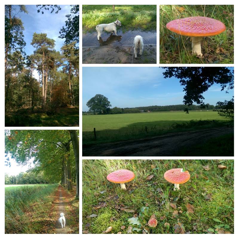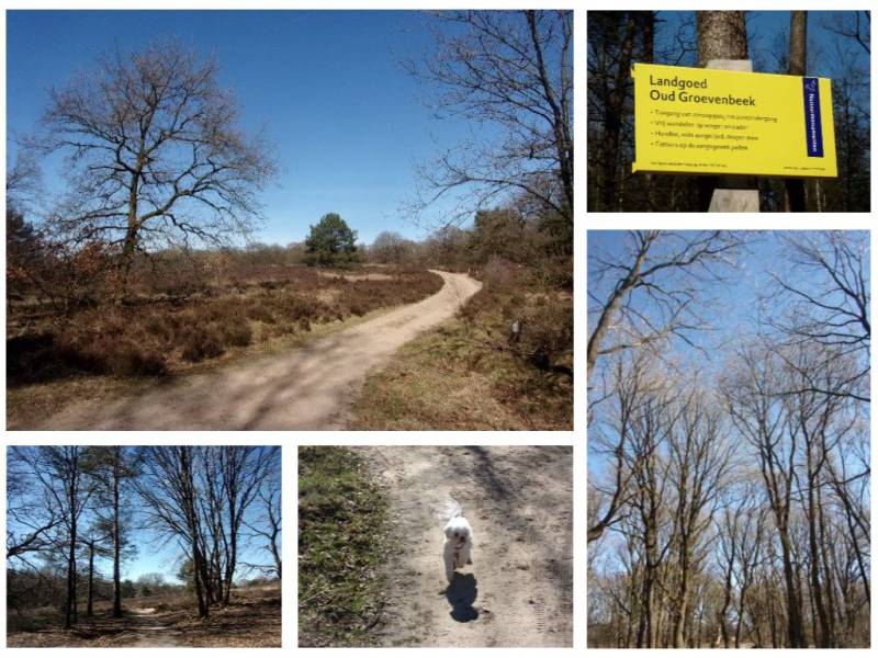 Bolle en ik werden later de dag uit gelaten op landgoed Houdringe in de Bilt. Landgoed Houdringe (230 ha) bestaat voornamelijk uit bos en open grasland. Er staan dikke eiken en beuken met een doorsnede van meer dan een meter. Deze bomen zijn ruim 225 jaar oud. We wandelden een klein blokje rond door het hondenlosloop terrein. Er waren veel mensen die hier hun viervoeter uit lieten, dus Bolle en ik waren heel druk met begroeten en besnuffelen van soortgenoten.
