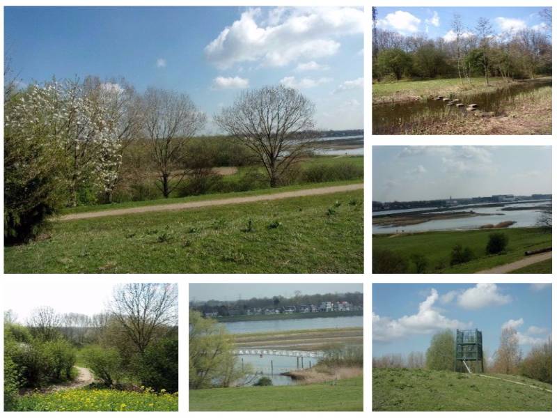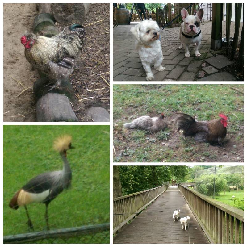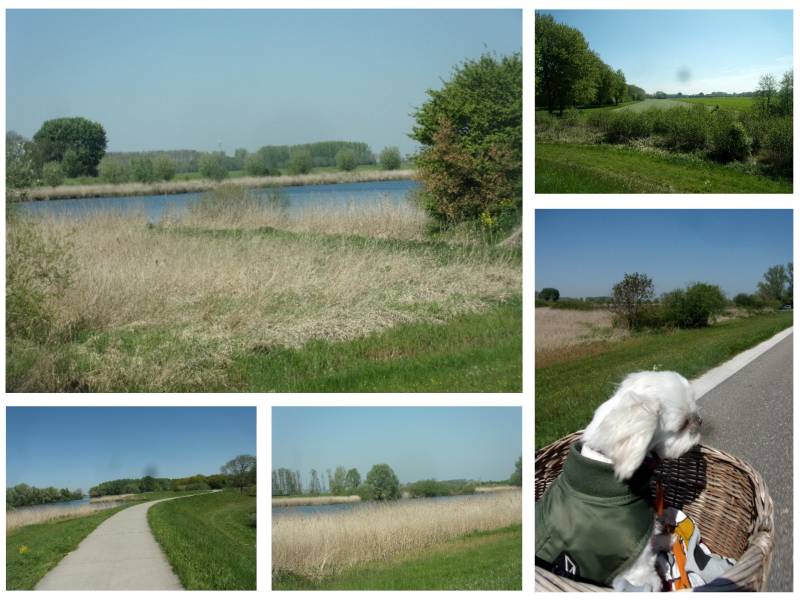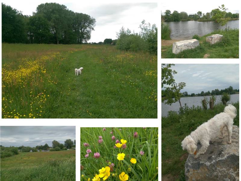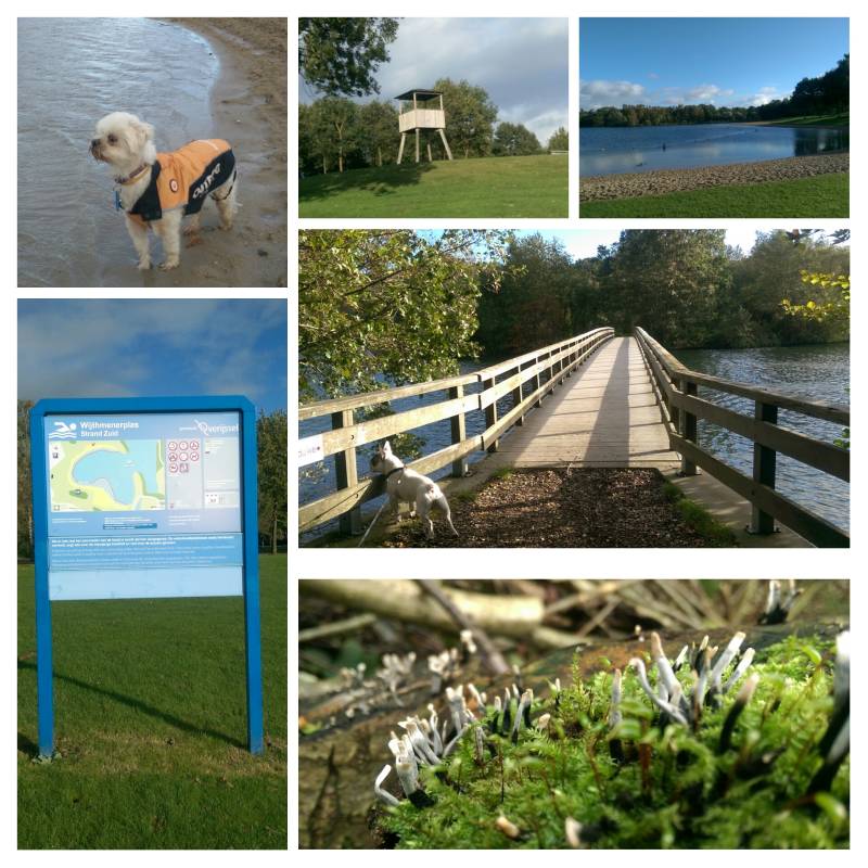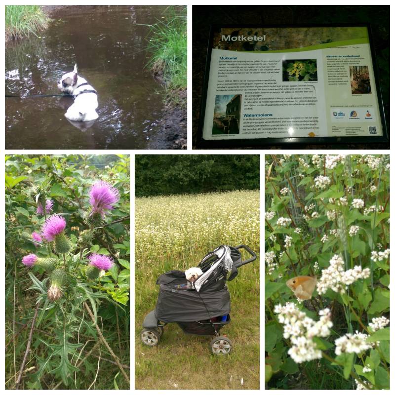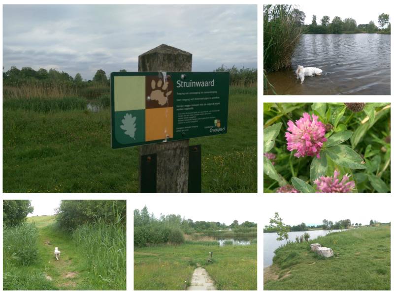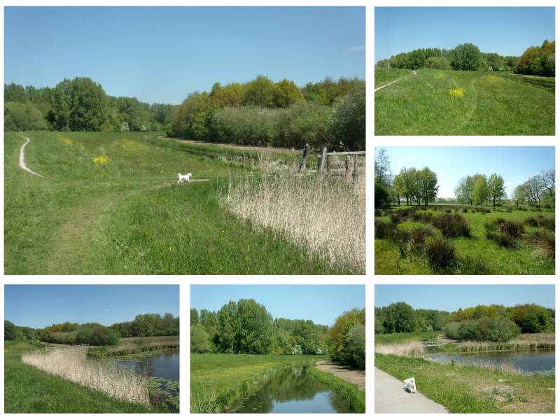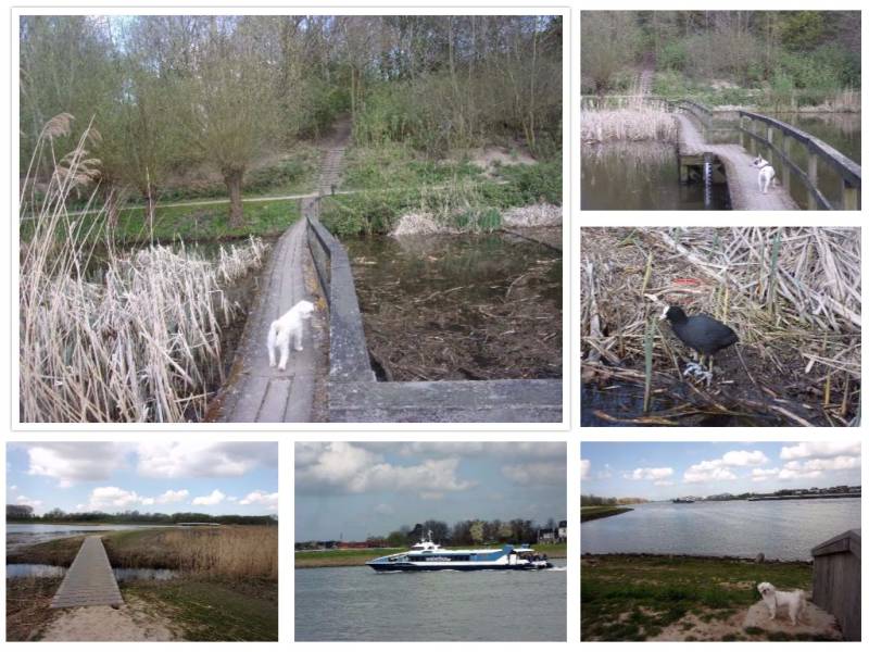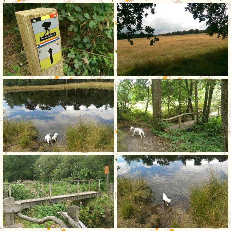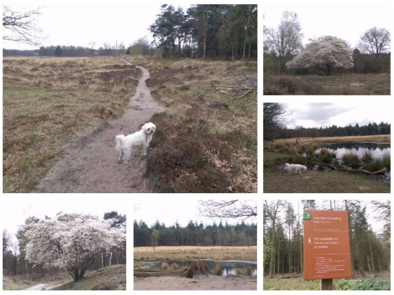 Vervolgens reden we naar het Lage Bergsche Bos. Dit recreatie gebied is in 1970 aangelegd en is 216 ha groot. Water en land wisselen zich hier mekaar af en aan de koeienvlaaien te zien en ruiken graasden er ook Schotse Hooglanders. Helaas kwamen we deze grote, harige koeien niet tegen. Af en toe wandelden we een stukje bos door waar zich ook vele houten bruggetjes bevonden over het water. Bolle is dol op water en modder dus die kon zijn lol op. We kwamen ook veel honden onderweg tegen waarmee we even mee speelden en aan snuffelden. Even onder de staart en aan de billen snuffelen hoort er nu eenmaal altijd bij. Ik wil alleen niet dat andere honden onder mijn staart of aan mijn billen snuffelen. Dan draai ik altijd snel om. We komen ook wel eens Nordic Walkers tegen; je weet wel die mensen met die zich met 2 stokken voort bewegen. Bolle snapt niet waarom hij die stokken niet van de mensen af mag pakken. Het is toch een stok waarmee je kunt spelen? Er waren ook verschillende gemarkeerde wandelroutes. Onze baasjes deden een poging om een route te volgen, maar zoals gewoonlijk raakten ze weer de paaltjes kwijt. Goede speurneuzen zijn het dus niet! Bij de auto waren Bolle en ik flinks smerig geworden, maar we hebben ons goed uit kunnen leven.