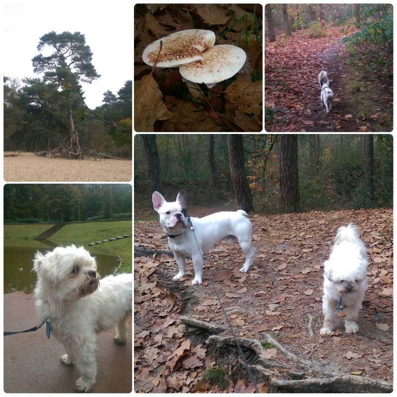Er werd gekozen voor de rode paaltjes route van 6 km. Daar draai ik mijn pootje niet voor om. In de jaren 20 was er in het bos ook een dierenpark met oa. Maleise beren, kangoeroes, apen en ooievaars. In de WOII zijn alle dieren afgemaakt en nu zijn er alleen nog maneschapen. Maneschapen, zijn geen schapen maar Noord Afrikaanse geiten. Ook is er even verderop nog een hertenkamp. Dat vonden Bolle en ik erg leuk. Jammer dat er een groot hek omheen zat. Honden mochten ook hier los lopen in het bos, dus Bolle en ik waren hier erg blij mee. Vooral Bolle gaat dan altijd uit zijn dak als hij van de lijn af mag. Ik daar in tegen maak me niet zo druk, ik snuffel en plas wat in de rondte.