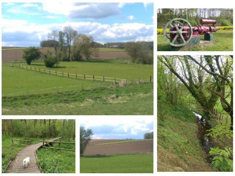 Omdat het niet zulk mooi weer was zouden Bolle en ik in de omgeving van Intratuin Barneveld worden uitgelaten voordat we het tuincentrum binnen gingen. Onze baasjes kozen voor de rode paaltjes route van 3 kilometer over landgoed Klein Bylaer in het westen van Barneveld. Een oud boerenlandgoed met een boerderij, weilanden en akkerland afgewisseld met bos en heide. In het gebied liggen sprengen, vennetjes en beken. Op natte bodem kon niet worden gebouwd. Het water bepaalde zo de plaats van de boerderij en de bijgebouwen. Die plek is al eeuwenlang onafgebroken bewoond. Het relatief warme en kalkrijke kwelwater werd afgetapt en gebruikt om grasland mee te bevloeien (de ‘vloeiweide’). De kwelkoppen zelf werden daardoor droger: daar werden akkers aangelegd. Het patroon van bebouwing, grasland en akkerland is al sinds 1800 vrijwel onveranderd.