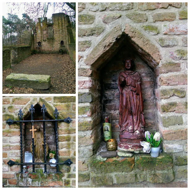 De gemarkeerde paaltjes route voerde ons ook langs de ruïne van de Middeleeuwse St. Walrickkapel uit de 15e eeuw en naastgelegen koortsboom. Deze plek is een bedevaartsplaats geworden waar al eeuwenlang mensen lapjes in de boom hangen om van een ziekte te genezen. Eigenlijk had mijn baasje er ook wel een lapje stof in kunnen ophangen, want die loopt al ruim twee jaar met een voetblessure rond….De 'koortsboom' heeft niet het eeuwige leven - het moge dan ook duidelijk zijn dat de genezende rol om de zoveel tijd moet worden overgenomen door een nieuwe boom. De huidige eik is zo’n honderd jaar oud.