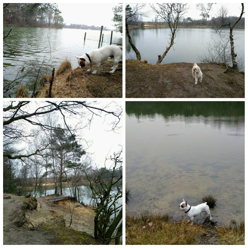 Parkeren is hier vlak bij de recreatieplas niet gratis, maar mijn baasje weet een parkeerplaats elders in de buurt wat niet zo bekend is en parkeren gratis is. Vanaf de parkeerplaats wandel je langs de oude Ossenstal (niet verwarren met de pannenkoekrestaurant de Ossenstal in Epe) langs de heide en over de heuvel het strand op. Onderweg begon het te regenen, zodat we eerst bovenlangs de plas onder de bomen wandelden. Zo werden we niet zo nat van de regen, want ik houd niet van een nat vacht. Op het strand hebben Bolle en ik nog lekker gerend en gespeeld.