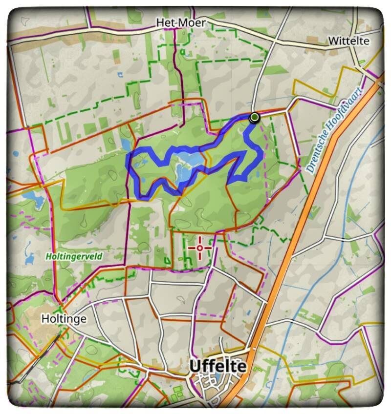 Vanaf hier wandel je gelijk het bos in van het Holtingerveld. We liepen ook langs het Brandenveen. Het Brandeveen is tussen 1910 en 1920 ontstaan door turfwinning. Onderweg kwamen we langs de restanten van het Uffelter Vaartje, meer dan 200 jaar geleden gegraven door de boeren van Uffelte om hun turf uit het Uffelterveen te kunnen weghalen.