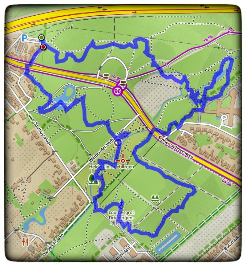 Aan de parkeerplaats "De Driesprong" aan de Hessenweg start de gemarkeerde wandelroute "De Driesprong Route" van 5 kilometer.