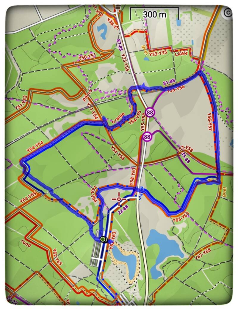 Op de bijgevoegde kaart is de blauwe lijn de route. Volgens het informatie bord zou de gele route 6 kilometer zijn, maar volgens mijn GPS ( en website) is hij 5 kilometer.
