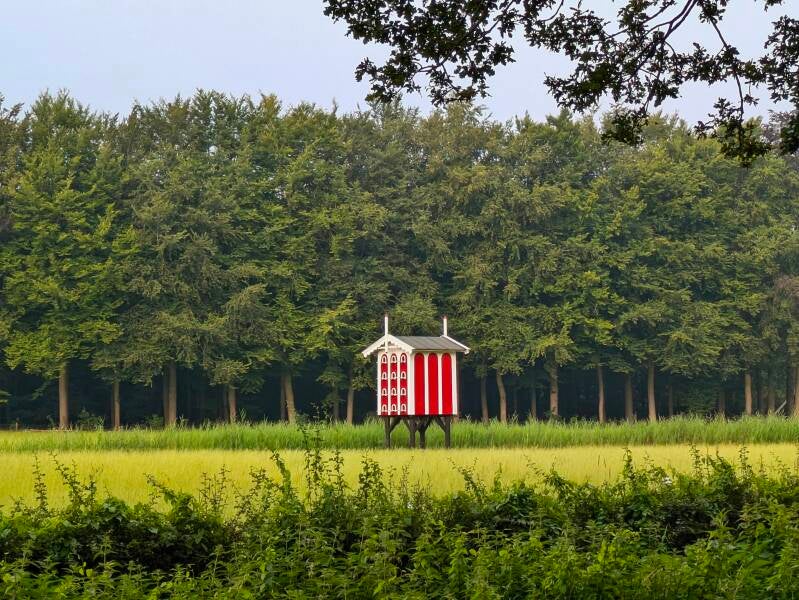 De wandelroute wordt gemarkeerd door rode paaltjes met een wit poppetje en richtingaanwijzer.